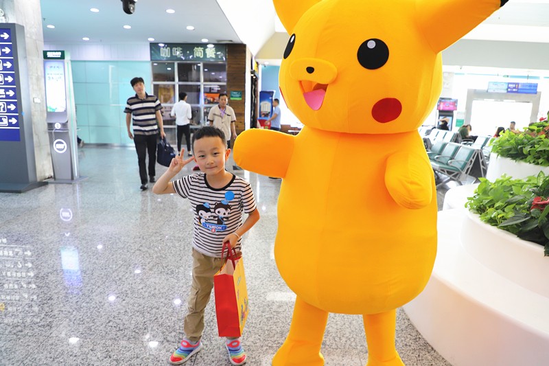 候机楼里,一只可爱的皮卡丘蹦蹦跳跳地向旅客们走过来。“妈妈,你快看!是皮卡丘,好可爱呀!”一个小女孩兴奋的叫到。皮卡丘时而对周围的旅客挥挥小胖手,时而俏皮地扭扭圆屁股,时而欢乐地原地转圈圈,时而摆出不同pose与旅客合影,时而拿些小糖果来“挑逗”小朋友,惹来一阵阵欢呼声,现场一下子就热闹起来,让过往的旅客不自觉地停住脚步,将目光投向了这可爱的“黄胖子”,更有些旅客掏出包里的手机,拍下了这可爱的一幕。